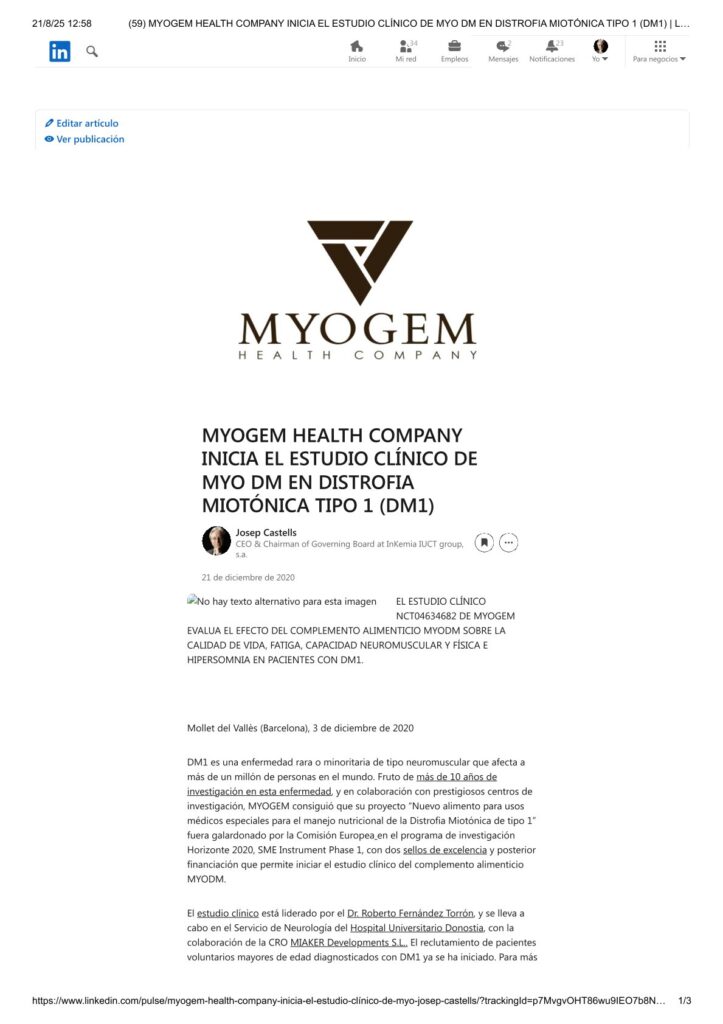 A finales de febrero de 2021 finalizó la fase de reclutamiento de pacientes, del estudio clínico NCT04634682 de Myogem que evalúa el efecto del complemento alimenticio MYO-DM sobre la calidad de vida, fatiga, capacidad neuromuscular y física e hipersomnia en pacientes con DM1.